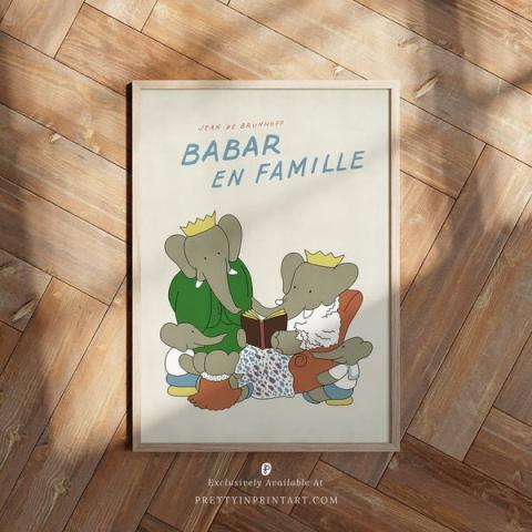 Your little one will love to look at this whimsical Babar print, the perfect addition to their nursery or bedroom. Featuring Babar with his family, reading a book, this framed print of a beloved elephant, available worldwide, adds a playful touch to any modern or vintage decor. Let their imaginations run wild! SIZES IN