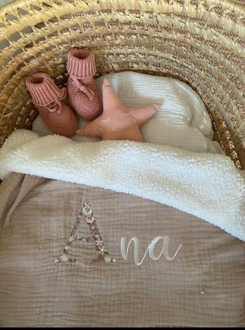 Couverture CHAUDE Taille au choix- Gaze de coton BEIGE foncé / Fourrure-Brodée et Personnalisée Lettre Fleuri - couverture HIVER