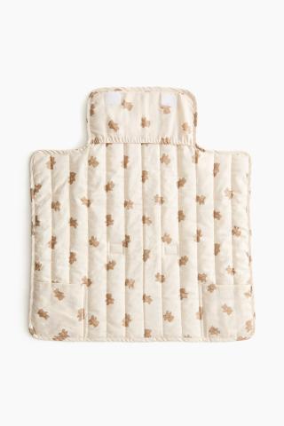 Tapis à langer en tissu de coton matelassé avec imprimé all-over. Modèle repliable offrant un espace confortable pour le change lorsque vous êtes à l'extérieur. Trois poches pour l'essentiel, dont une avec ouverture élastique. Fermeture auto-agrippante sur l'arrière. Dimensions une fois replié 16x30 cm.