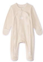 Dors-bien en velours. Coloris uni beige. Encolure ronde. Ouverture pressionnée effet pont à l'avant. Broderie feuilles sur le devant. Arrière uni. Manches longues. Moufles retroussables. Pieds fermés.