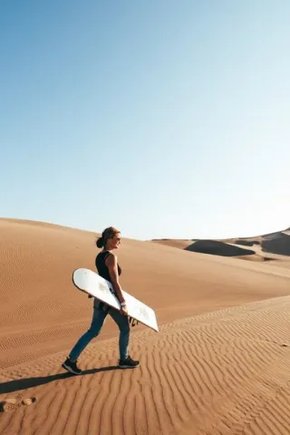 In Huacachina een tourtje met de buggy鈥檚 richting de woestijn. Deze futuristische voertuigen scheuren met hoge snelheid door de woestijn en voor je het weet sta je bovenop een enorme zandduin. Daar leg je jouw board met de punt over de rand en ga je met je buik erop liggen terwijl je de touwen aan de bovenkant van het board vasthoudt. Je krijgt een duwtje om over de rand te komen en glijdt vervolgens met hoge snelheid recht naar beneden.