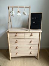 Minimalistische wagenhanger "Puck" van Speen en Koord bestaat uit grote houten kralen (met en zonder groeve), een ring, een belletje en een gegraveerde clip. De wagenhanger bevestig je eenvoudig aan het zachte gedeelte van je kinderwagen. Bij het bewegen maakt het belletje een geluidje wat de zintuigen van je baby pri