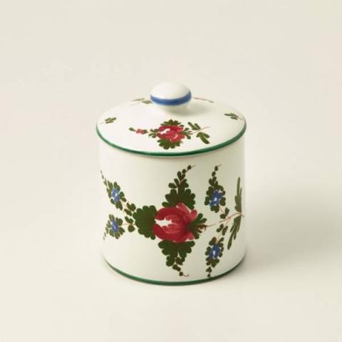 Large majolica jam jar, lid with knob, h. 9.5 cm. Hand decorated, made in Italy.