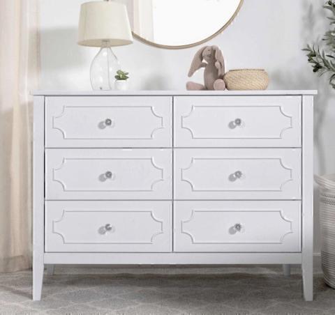 The Chloe Regency 6-Drawer Dresser is the perfect match to the Chloe Regency 4-in-1 Convertible Crib. Featuring elegant molding details and crystal knobs, this dresser is sure to add the perfect touch of luxury to any nursery.