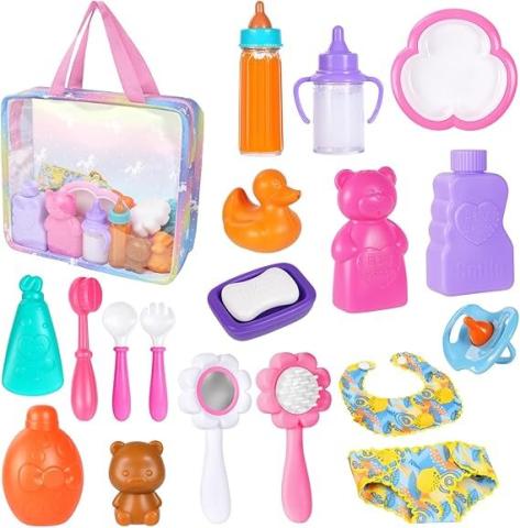 Aolso New Born Doll Accessories, 20 Pieces Doll Accessories = 1 Carry Bag + 3 Feeding Sets + 3 Dishes + 2 Combs & Mirrors + 2 Diaper Bibs + 9 Bath Accessories : Amazon.com.be: Toys