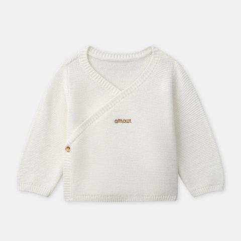 Pour les bébés calmes et curieux, idéale pour la saison printanière. Brassière en laine et coton, ouverture croisée à nouer et bouton pression intérieur. Broderie « amour » caramel, look doux et naturel. Laine et coton Tricot en point mousse de couleur écrue Ouverture croisée à l'avant avec bouton gravé "Sergent Major"