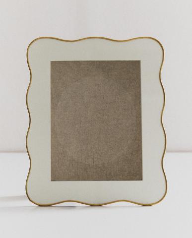 Cadre photo avec bord métallique et silhouette ondulée. Il peut être posé verticalement ou horizontalement et accroché au mur avec les fixations à l'arrière.Existe pour photos au format 10 x 15 cm et 15 x 20 cm.