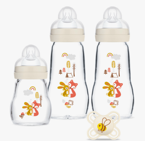 Ce coffret comprend : un biberon en verre 170 ml, 2 biberons en verre de 260 ml et 1 sucette anatomique.