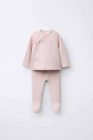 Completo a due pezzi. Maglietta con collo a V e maniche lunghe. Chiusura incrociata frontale con bottoni a pressione. Ghetta con vita elasticizzata.