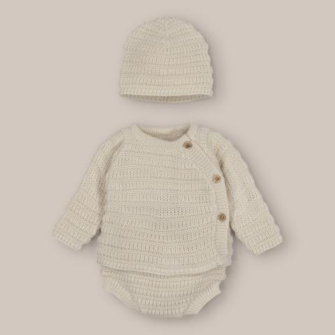 Conjunto de punto para bebé formado por jersey de punto perforado, con cierre lateral con botones de madera, culotte de bebé con goma en cintura y perneras ,y gorro a juego.