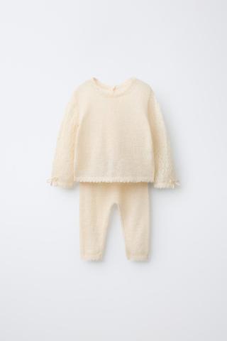 Conjunto dos piezas. Jersey de punto con cuello redondo y manga larga con aplique lacitos. Cierre de botonadura en espalda. Pantalón con cinturilla elástica. Tejido con 15% de lana y 10% de alpaca.