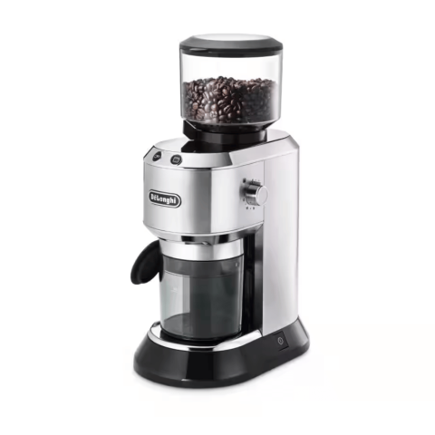 Discover the De'Longhi coffee grinder with 18-level selector for precision grinding. It has a 350g capacity and grinds directly into the filter holder or container.