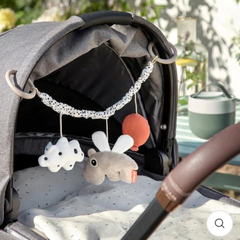 Das elastische Kinderwagenspielzeug in anregenden Kontrastfarben ist sehr flexibel und lässt sich mit Hilfe von Verbindungsstücken leicht am Kinderwagen, Autositz oder Buggy befestigen.