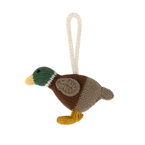 Duck. In shades of brown, yellow, and green. Lovingly handmade in Peru. CE.