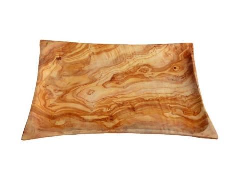 Prostokątna taca z drewna oliwnego o wymiarach 30×20 cm.