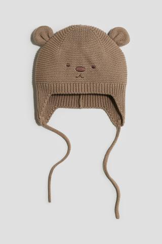 Een muts van zacht, gebreid katoen met vastgestikte oortjes en geborduurde details voor. Het model heeft oorflappen en strikbandjes onder de kin.