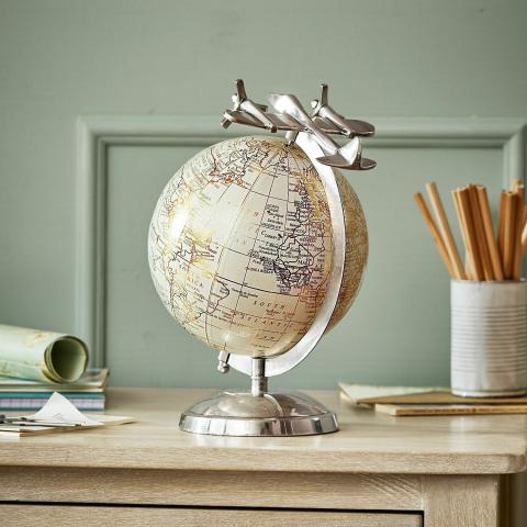 Ce globe décoratif dont la conception invite à la rêverie fait entrer le monde dans votre maison. Le support en fonte d'aluminium scintillante maintient le globe imprimé avec force détails, tandis que le petit avion stylisé qui le surmonte symbolise le d…