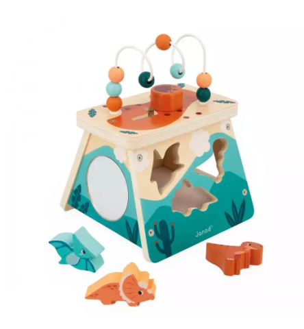 De activiteiten kubus van het Franse merk Janod is vervaardigd van hout en bestaat uit acht verschillende spellen. De spellen zijn stuk voor stuk ontworpen om diverse motorische vaardigheden te prikkelen. Elke zijde heeft een andere activiteit; draaien, voelen, duwen ... De speelbox is geschikt voor kinderen vanaf 12 m