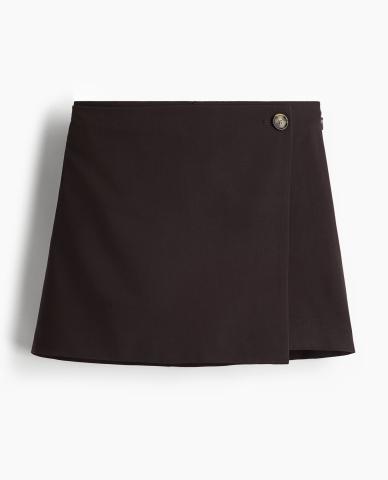 Taille 44, marron foncé - Jupe-short courte en tissu de viscose mélangée. Modèle avec pan croisé devant, maintenu par bouton, et fermeture par agrafe et zip dissimulés sur un côté.