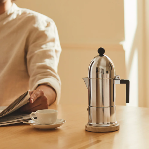Scopri La Cupola, l'iconica caffettiera per espresso di Aldo Rossi ora per piani a induzione, disponibile con opzioni di manico e pomolo nero o blu.