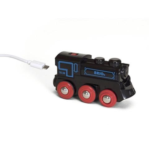 Avec la locomotive noire rechargeable qui s'adapte sur tous les trains et circuits Brio, fini les piles !