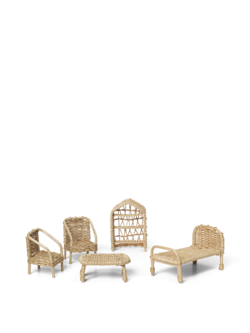 The set includes a bed, table, two chairs and a bookshelf, all made by hand using only natural rattan.