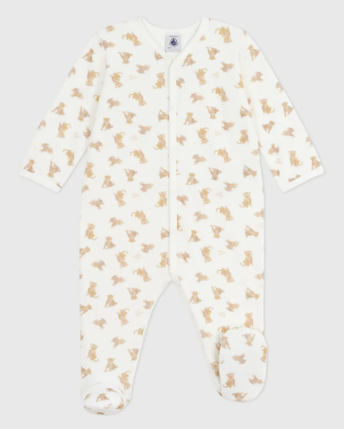 Petit Bateau pyjama met voetjes en luipaardprint. Gemaakt van fluwelen bouclé katoen. Warm, zacht en met handige drukknoopsluiting.