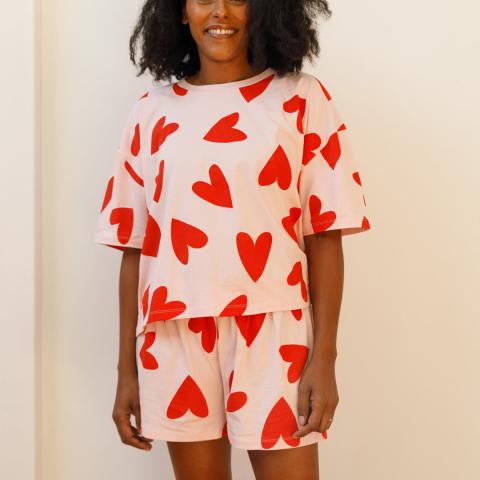 Un pyjashort femme en coton BIO : T-shirt oversize et short confortable ! Pyjama short Mi Amor Rose, cœur rose. Marque française, éthique, tissus certifiés BIO et OEKO-TEX.