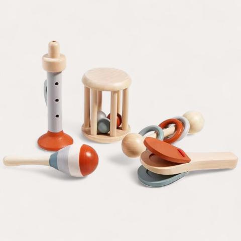 Set d'instruments de musique Montessori en bois de 5 pièces pour enfants, idéal pour développer la motricité fine, la coordination et la sensibilité musicale.