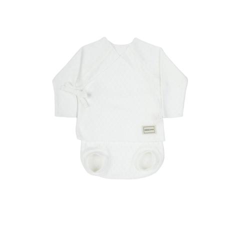 First outfit, a must-have in the hospital bag. Set composed of a crossover top and shorts. Made in Holey, soft openwork cotton knit. You can also find the matching hat. One size – Newborn 100% cotton