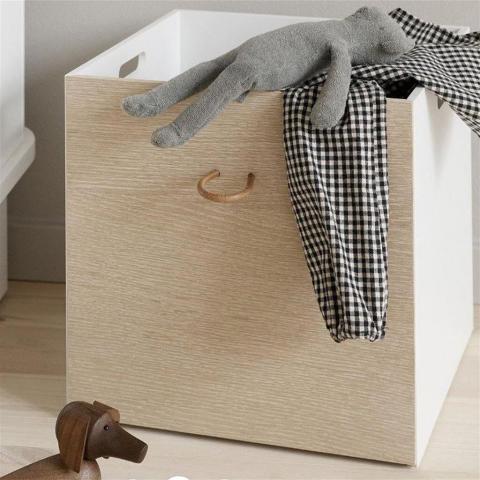 Charming storage boxes from Oliver Furniture. The boxes feature both a white and an oak side, each finished with a beautiful leather handle, making it easy to pull the box out of the shelf or lift it up. You can choose which side you prefer to use as the front. Dimensions: 32 x 32 x 32 cm Set of 3