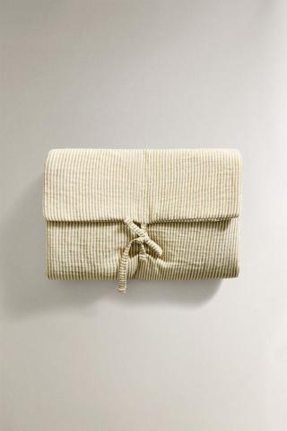 Portable cotton muslin baby changing mat with a striped design. Drawstring fastening.