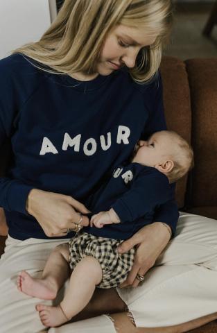 Sweat allaitement "LOVE IS BLUE". Coton bio certifié GOTS avec zips invisibles sur les côtés pour un allaitement discret.