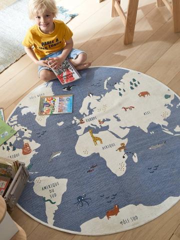 Un tapis rond comme notre planète, qui invite les enfants au voyage et leur permet de situer les continents ! Un élément déco ludique et éducatif très joliment illustré !