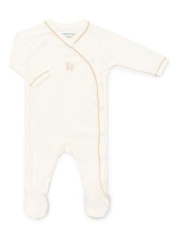 Zacht en comfortabel babypakje van irregular rib in een lieve creme kleur, met geborduurde konijntjes op de borst en een schattige crochet rand langs de druk...