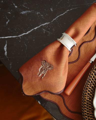 Napkin in linen and cotton with cut-out finish and figurative embroidery inspired by the wild. Each piece features an embroidered animal - lion, zebra, elephant, or giraffe - on a terracotta background, making the table more fun and unique. Composition: 87% Linen / 13% CottonDimensions: 45x45 cm Available models: Lion
