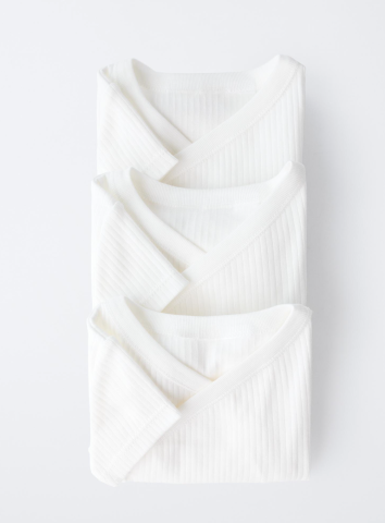 Three-pack of bodysuits with kimono collar and short sleeves. Snap button closure at the bottom.
