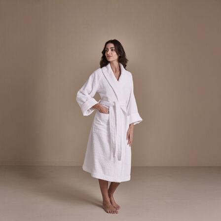 Un peignoir à col châle en coton éponge ultra-doux, muni d'une ceinture et de poignets repliés en satin de coton. Ses coutures sont recouvertes d'un biais en satin de coton à l'intérieur du peignoir pour un confort décuplé. Pur coton.