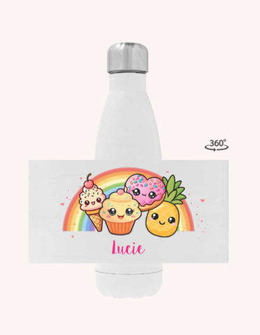 Witte drinkfles RVS met kawaii illustraties, regenboog en hartjes