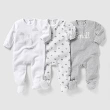 Le lot de 3 pyjamas en velours. Lot composé d'1 imprimé "nuages 1 uni avec animation "pinguin" sur le devant 1 uni animation "texte"sur le devant. Fermeture et pont au dos pressionnés. Pieds antidérapants à partir de 12 mois (74 cm), élastiqués au dos pour un meilleur maintien Composition