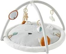 Un tapis de sol tout doux et confortable sur lequel vous pourrez installer bébé pour ses jeux et activités. Un patchwork de jolis motifs savane, des oreilles en volume et une crinière en relief pour