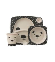 Service de table pour bébé, avec des pois et un adorable imprimé de museau d’animal. Le service de table est composé d’une assiette, une tasse, un bol et une cuillère.