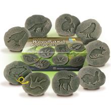 Een set van 8 ontdekstenen met pootafdrukken van bosdieren van Yellow Door. Elke dubbelzijdige steen heeft aan de ene kant de pootafdruk van een bosdier en aan de andere kant de afbeelding van het dier. Er zijn pootafdrukken van een vos, eekhoorn, konijn, kikker, hert, buizerd, uil en muis. Druk de pootafdruk in zan