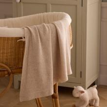 Plaid van zachte lamswol met details in ajourtricot. Een verfijnde stijl en zachte kleuren. 100 x 70 cm