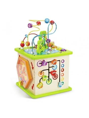 Des labyrinthes, des formes, des leviers et de nombreuses créatures qui volent, qui nagent et qui croassent font de ce centre d'activités à cinq faces un jouet passionnant. En bois robuste, décoré de peintures à l'eau, il résistera à des années de jeu.