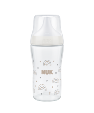 Mit einem weichen und flexiblen Sauger, der sich perfekt an den Mund deines Babys anpasst, der NUK Anti-Colic Funktion, 3 Durchflussstärken (S, M, Flow Control) sowie einer Temperaturkontrollanzeige.