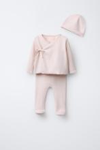 Newborn set. V-neck long sleeve T-shirt. Crossover front fastening with bow appliqué. Leggings with elasticated turned-up waistband. Hat with turned-up hem.