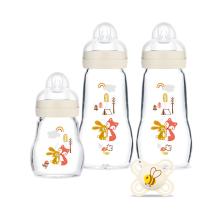 Ce coffret comprend : un biberon en verre 170 ml, 2 biberons en verre de 260 ml et 1 sucette anatomique.