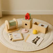 Ensemble Montessori pour bébés de 6 à 12 mois. Jouets éducatifs en bois qui stimulent de manière ludique la motricité, les sens et la confiance en soi.