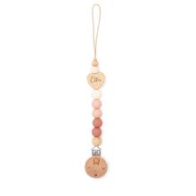 Pacifier clip Handmade in the Netherlands using silicone beads and wooden bead in a Heart Shape. Designed to match Frigg Colour Block Pacifiers.Details Handmade in Netherlands Laser engraved wooden bead with baby's name Length Approximately 8.2" (~20.8cm) Food-grade silicone natural untreated juniper and beech wood (na